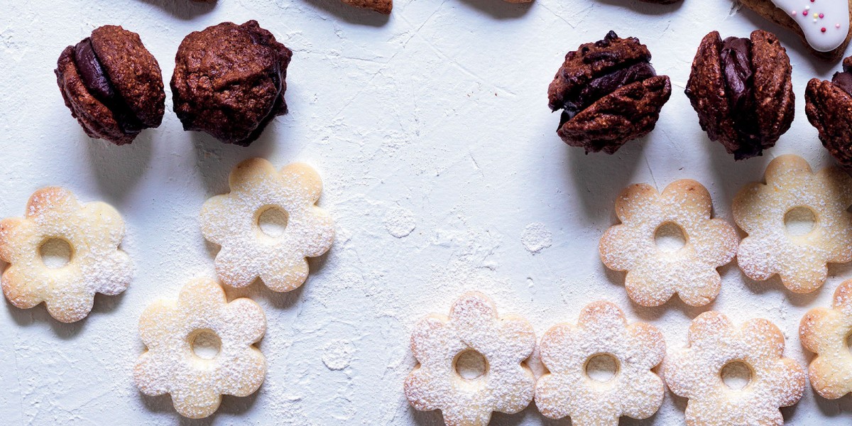 Blend them in a food processor with the sugar, obtaining a powder; combine this mixture with the egg whites, the honey, and the cocoa powder until you obtain a thick batter. Place the batter in a pastry bag with an open star tip; pipe small dollops on a baking tray lined with parchment paper. Bake at 400°F for 10-12 minutes; remove from the oven and let cool, then spread half with a bit of the melted chocolate and top with another cookie to form little sandwiches.
