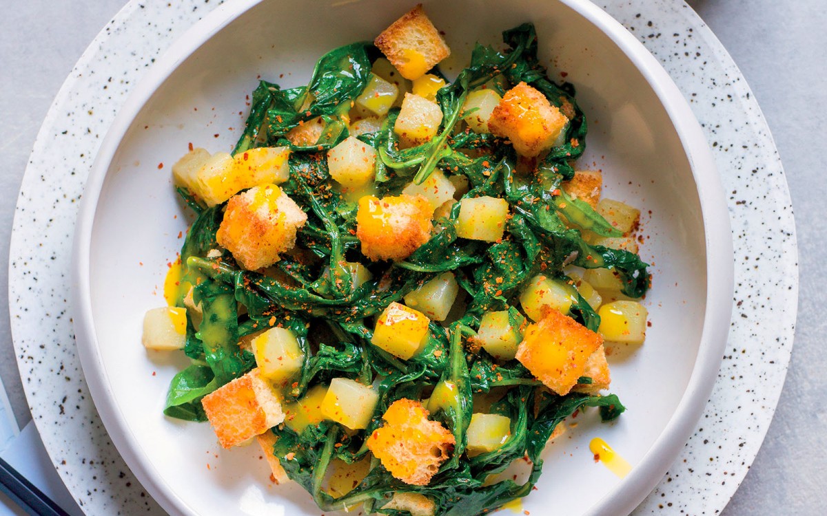 Heat a little oil in a saucepan and add the anchovy fillets and let them melt. Add 2 Tbsp. white wine, the chicory, and a dash of water. Cook for another 2 minutes. Add the potatoes and cook for another 2 minutes. Remove from the heat, let rest for 5 minutes, then add the beaten egg yolks, a dash of water and chili pepper, and top with croutons and serve.