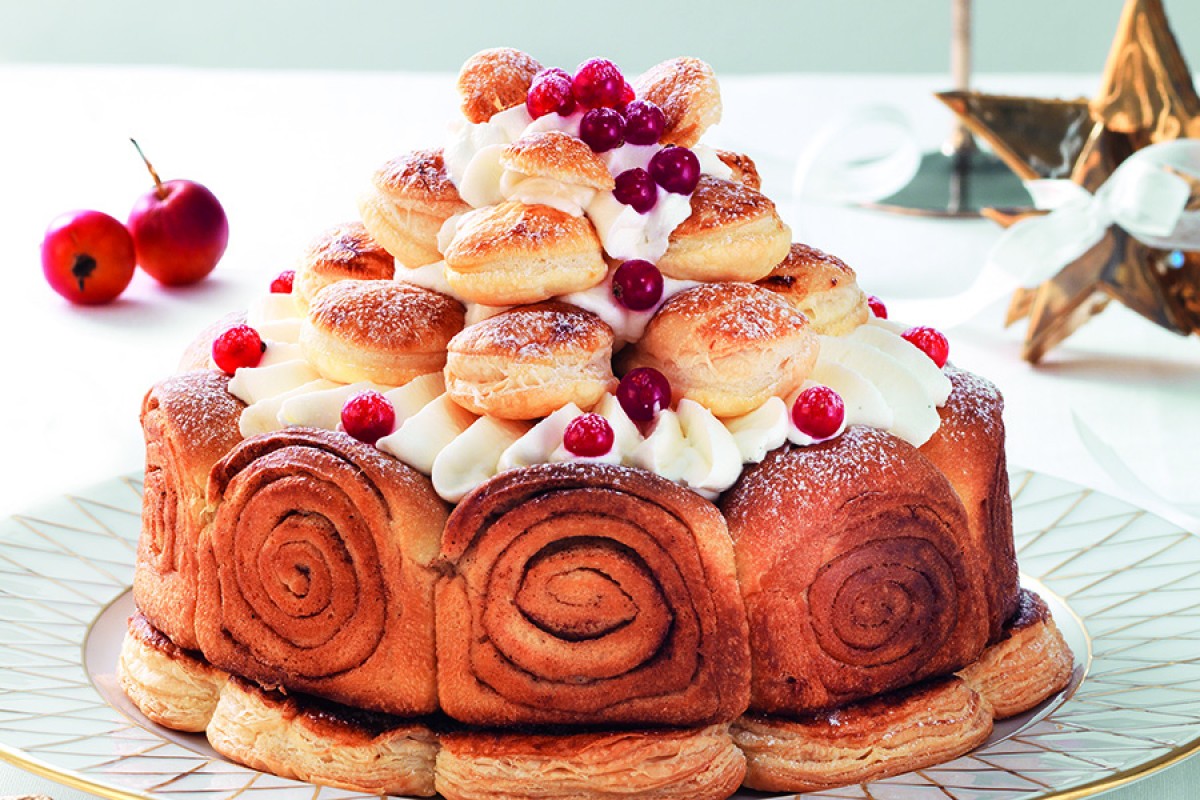 into “pinwheels” about 3/4-inch thick. Butter the inside of a springform pan (7 1/2-inch diameter) and the outside of a smaller pan, which you will place in the center. Choose the prettiest pinwheels and place them standing up, lining the inner edge of the larger pan, leaving about 1/2 inch between each. Let it rise for 30 minutes, then bake at 350°F for 25 minutes. In the meantime, peel the apples, cut them into quarters, and remove the core. In a pan, melt a tablespoon of butter together with 2 tablespoons of granulated sugar; when it begins to turn golden, add the apples and cook them for about 15 minutes. Cut out a disc of puff pastry dough 9 inches in diameter. Strengthen the edge by placing a ring of puff pastry dough on top; if you like, shape the edge into petals. Brush the disc with an egg yolk beaten together with a bit of water; perforate it with a fork and bake at 350°F for 10 minutes; dust it with powdered sugar and bake for another 6-7 minutes. For the small biscuits, cut the remaining puff pastry dough into small discs or teardrops; brush them with the egg yolk and bake them at 350°F for 6-7 minutes. Mix the Greek yogurt with the whipped cream and the seeds from half a vanilla bean pod. Remove the pinwheel “crown” from the oven and let them cool. Then place it on top of the puff pastry disc and fill with the cooked apples. Decorate the dessert with the yogurt cream using a piping bag: first create a double layer of the cream, then alternate the cream with the biscuits to form a sort of tree shape. Top with currants and powdered sugar.
