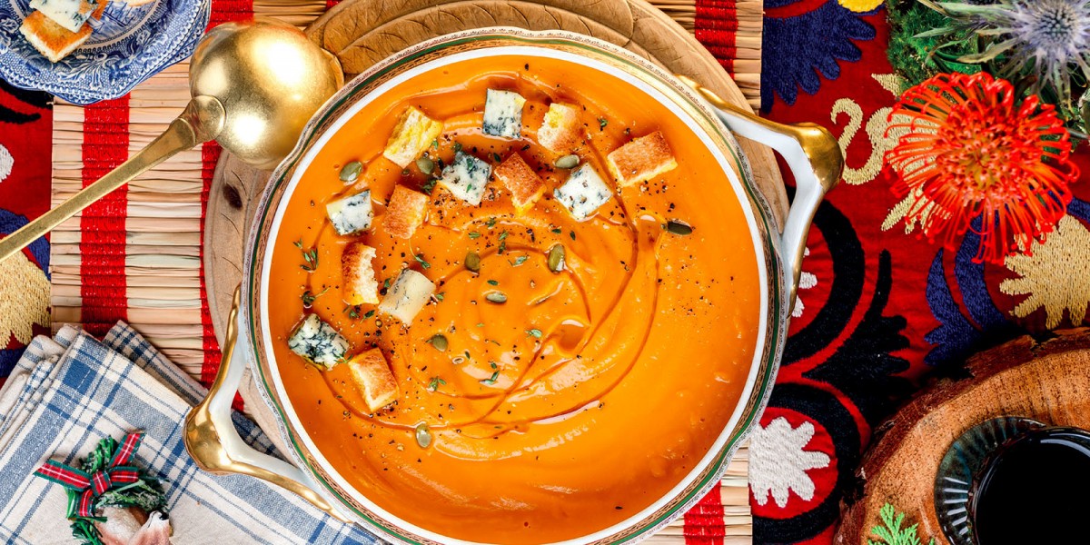 Remove the crusts from the sandwich bread, cut the slices into small squares, and toast them in a 400°F oven for 7-8 minutes. Cut the gorgonzola into cubes. Top the soup with a drizzle of oil and some freshly ground pepper; serve topped with the croutons, the gorgonzola, and a small handful of pumpkin seeds.