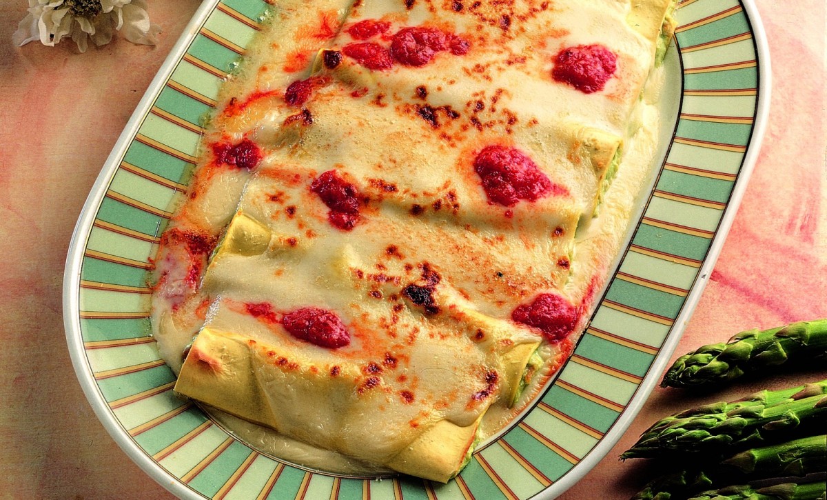 Cook the asparagus in boiling water for about 10 minutes. Remove the tips and set them aside. Cut the chicken into chunks and sauté in a frying pan with 2 tablespoons of oil; add salt to taste. In a food processor, blend the cooked chicken and the asparagus stalks. Mix the ricotta with 1/2 cup of Parmigiano and the chicken and asparagus mixture; add salt and pepper to taste. Parboil the pasta. Divide each piece in half. On each half, add some of the filling and a few asparagus tips; form 12 cannelloni. Place them in a baking dish and add the bechamel, tomato passata, and grated Parmigiano. Bake in the oven for 10 minutes.