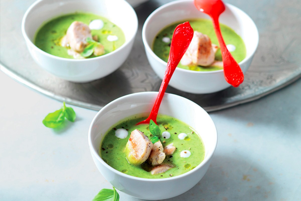 To make chicken with zucchini velouté, first cut the zucchini into small pieces; trim the chicken breast and cut into bite-sized pieces.|Place the zucchini in a pot of cold water, then add 2 bay leaves and the peeled and roughly chopped shallot. Bring to the boil and cook for 20 minutes.|Meanwhile, heat the chicken pieces in a dry, non-stick frying pan. Cook for 8-10 minutes, turning frequently. Add salt and pepper at the end.|Drain the zucchini, reserving their cooking water. Transfer to a container ad add 3 basil leaves|and the yogurt.|Next, transfer to an immersion blender and blend; you can add a little of the cooking water if it is too thick. Divide the velouté between a few small bowls and add the chicken pieces. Garnish with a little fresh olive oil, a few drops of yogurt, a grind of pepper and some basil leaves.