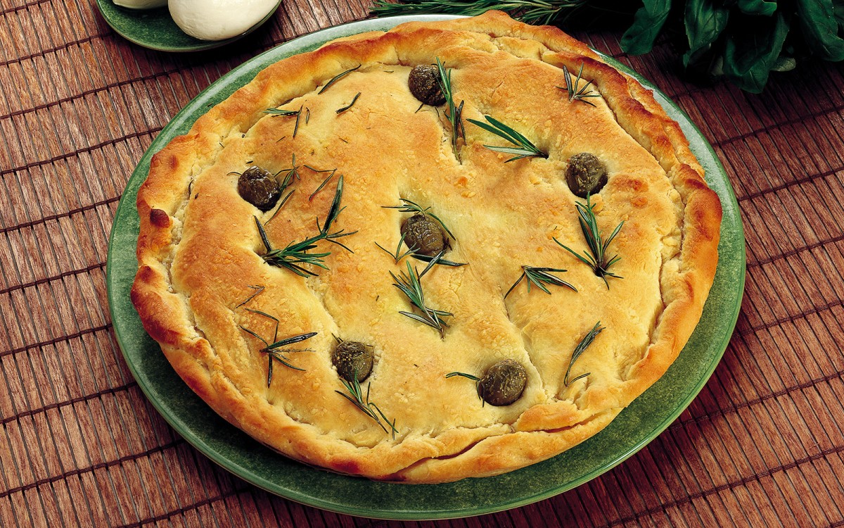 Extend the remaining dough by hand and place over filling, pressing along the dough edge to seal, Sprinkle with green olives, a few rosemary needles and a big pinch of salt. Drizzle with olive oil and let rise for around 30 minutes.