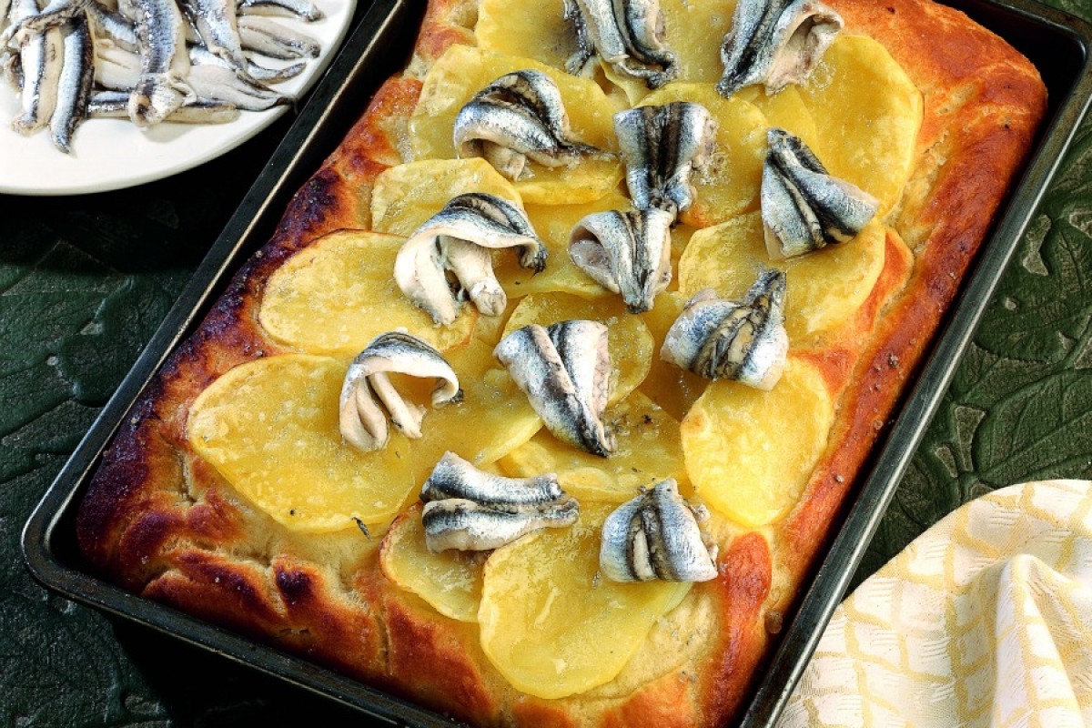 Roll out the dough on an oiled, deep, rectangular baking tray (approx. 6”x10”). Arrange the potato slices on top, overlapping slightly, and season with a little salt. Drizzle with a little oil and brush the edges with a little more. Bake focaccia for about 12 minutes until fully cooked and golden. Arrange anchovy fillets evenly over the top and serve.