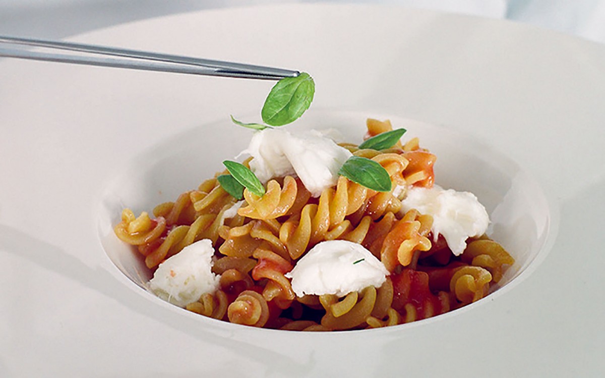 Drain pasta when al dente and add to the pan with the sauce. Cook for 1 minute over low heat, then serve with diced mozzarella, garlic purée and basil leaves.