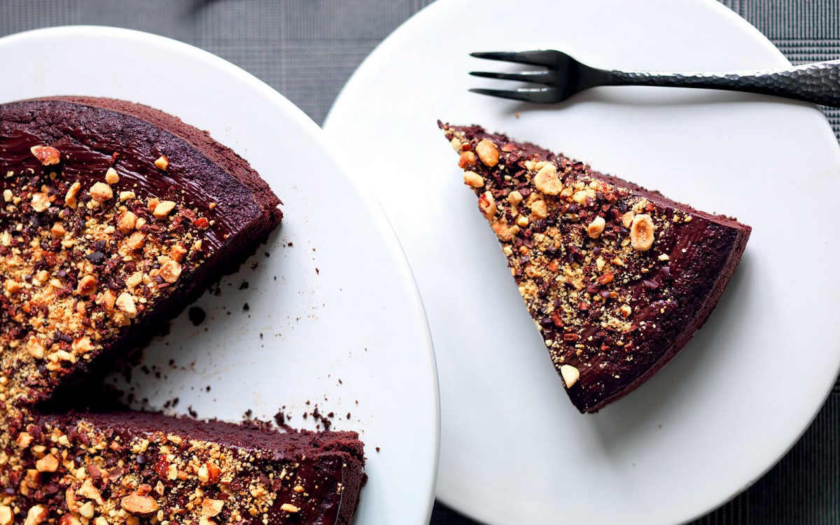 In a bain-marie, melt 3.5 ounces of the chocolate with 3 tablespoons of powdered sugar, sifted directly into the bowl, until you obtain a glaze. Pour the glaze in the center of the cake and spread it across the entire surface with a spatula. Chop up the hazelnuts and the remaining chocolate, mix them together in a bowl, and sprinkle them on top of the cake.