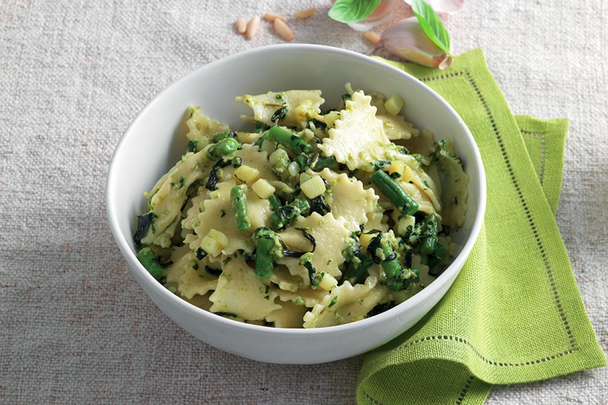 Bring a pot of water to the boil, add salt, and cook the green beans. After 3 minutes, add the pasta and potatoes and cook for 5-7 minutes. Remove using a skimmer and toss with the pesto to coat. Garnish with grated cheese and basil.