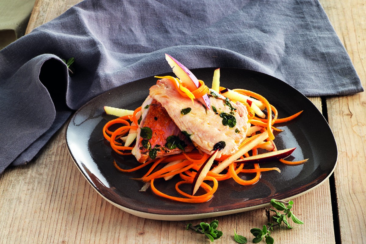 Serve the mullet fillets with the apple and carrot slices, garnishing with marjoram leaves and drizzling with a little extra-virgin olive oil.