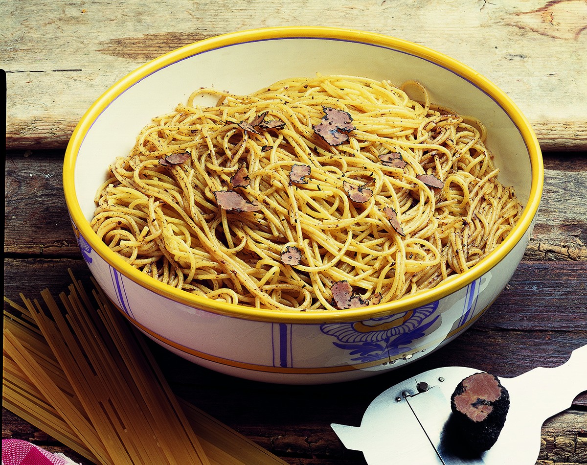 Bring a large pot of water to boil; as soon at it boils, add salt and the spaghetti; cook until al dente. Drain (leaving some pasta water clinging to the pasta) and transfer immediately to a serving bowl; toss with truffle sauce to coat well and serve.