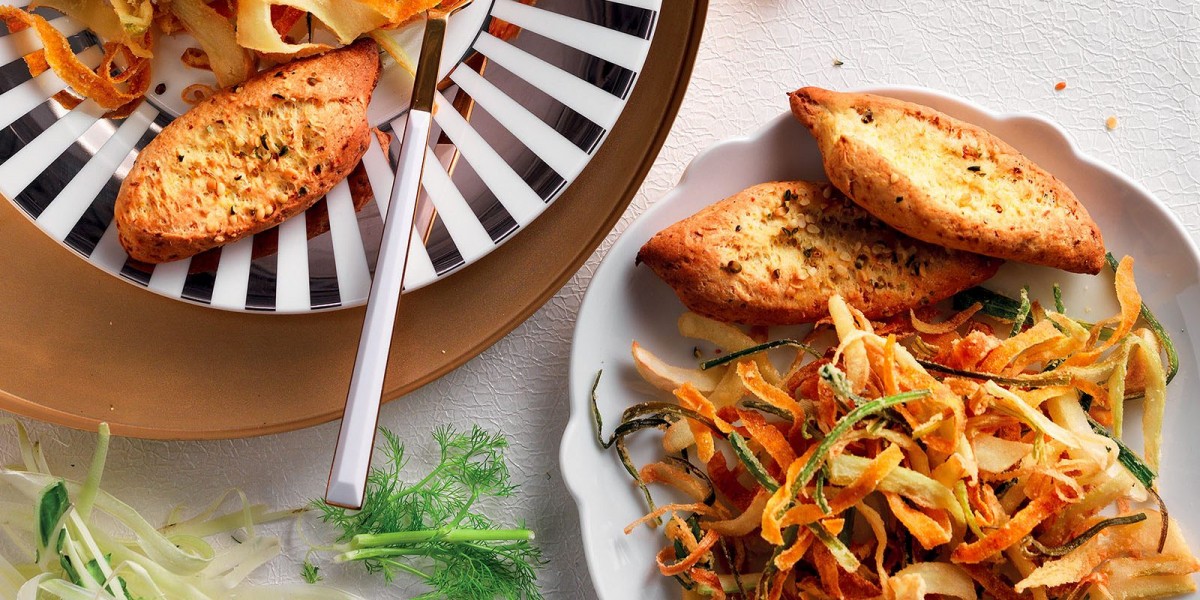 Microwave all cut vegetables: leek for 2 minutes, carrot peels for 2 1/2 minutes, and celery and fennel for 4 minutes. Dip all in a container with cold milk. This process is used to even out the textures and encourage a crispy crust to form. Drain the vegetables and dredge in 4-5 Tbsp. semolina. Fry in plenty of peanut oil. Drain on kitchen paper, season with salt and serve immediately.