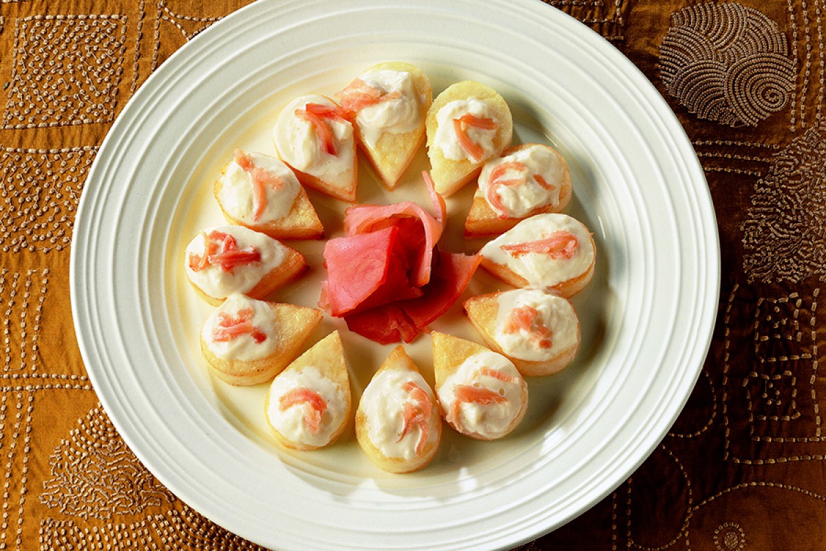 Line a baking tray with parchment paper and pour the polenta onto it. Spread evenly to 1/2" thickness. Once hardened, cut into 18 pieces with a tear drop-shaped pasta cutter (2 1/4 x 1 1/2".).