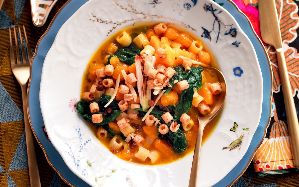 Peel a piece of ginger and cut it into 1/8" matchsticks. Distribute the minestrone into deep dishes and top with the spinach leaves, sautéed spring onions, and the ginger. Add croutons to taste.