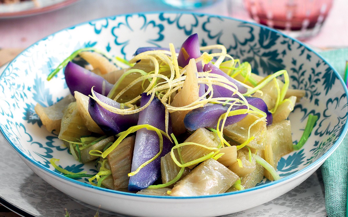 For the purple potato and cardoon sauté with lemon zest recipe, rinse the potatoes and boil them for 35-40 minutes, until tender. Separate the cardoons from the head and peel them with the potato peeler as you would a stalk of celery; cut them into pieces about 4 cm long, gradually dipping them in lemon water to prevent them from turning black. Pour the milk into a saucepan with one and a half quarts of water and the juice of half a lemon and bring to a boil, then cook the cardoons for 30-35