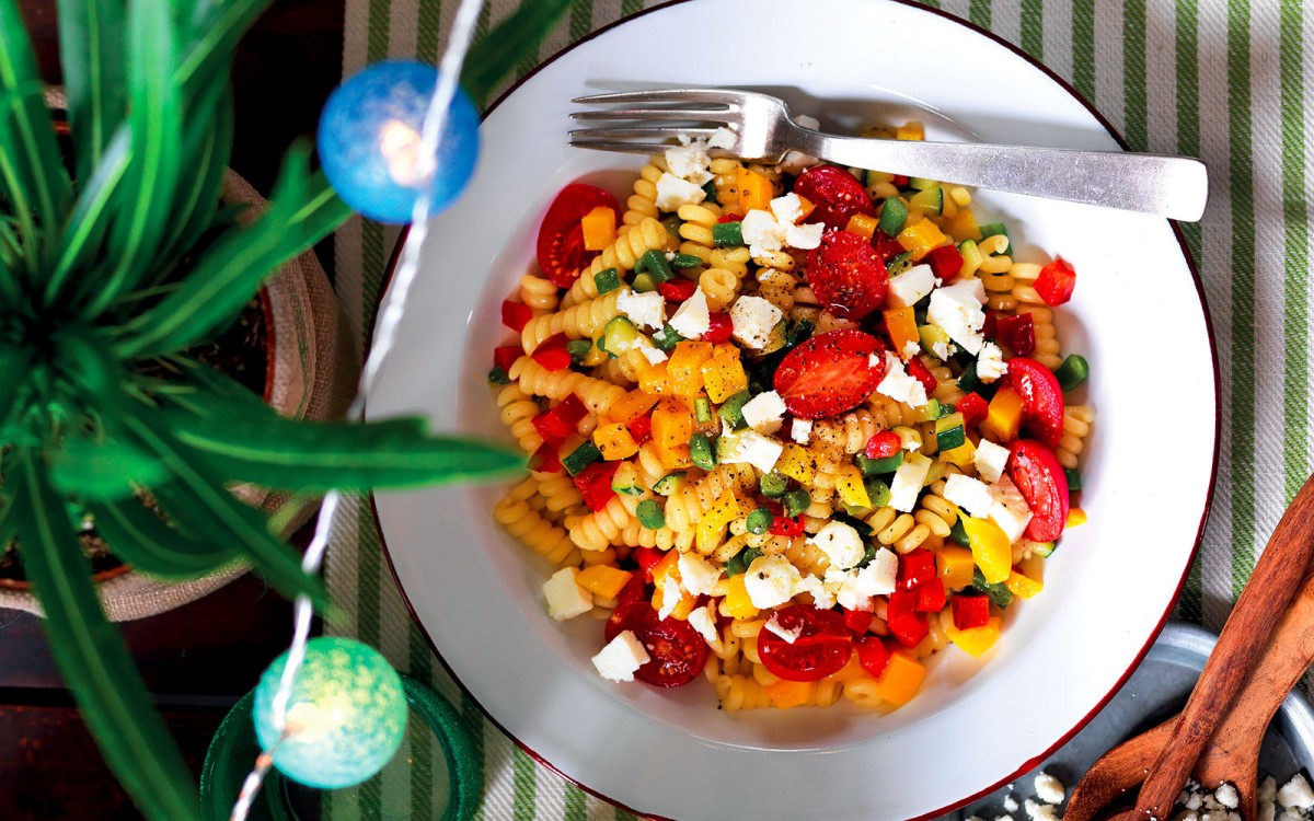 Slice the shallot and sauté it until soft in a large saucepan (it should be big enough to hold the pasta) with a drizzle of oil and a pinch of salt. Heat a pot of water and, once it boils, add a large ladleful of the hot water to the pan with the shallot; continue cooking for another 3-4 minutes. Add the fusilli to the pan with the shallot, mix well, add salt to taste and pour boiling water over the pasta to cover. Cook the pasta according to the package instructions, adding additional boiling water if needed and stirring occasionally. Trim the green beans and slice them; wash the zucchini and bell peppers and cut them into cubes (to make the peppers more digestible, they can be peeled with a vegetable peeler). Add the vegetables to the pasta 4-5 minutes before it is finished cooking; add salt to taste. Wash the cherry tomatoes, cut them in half, and add them to the pasta a few seconds before turning off the heat. Top the fusilli with a drizzle of oil and some freshly ground pepper, add crumbled ricotta salata and serve.