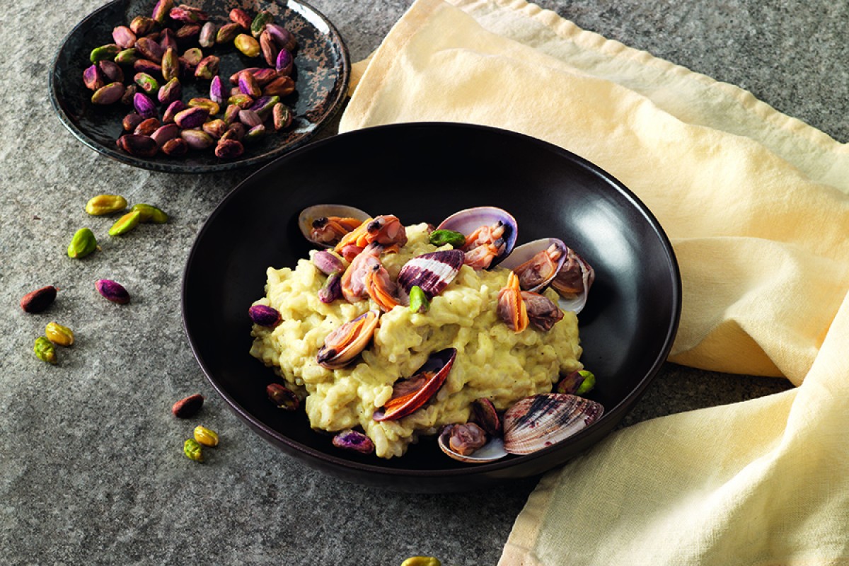 Serve the risotto immediately, garnished with some pistachios and the clams in their shells.