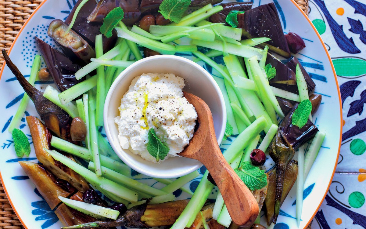 Serve the eggplant with the creamy ricotta cheese, the cucumber sticks and a spoonful of pitted black olives. Season with mint and pepper.