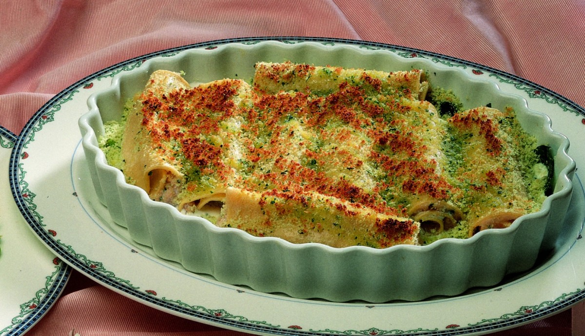 In a food processor, chop the salmon, mushrooms, 3/4 cup of cream, half an egg white, salt, and chervil, then spread the mixture onto the parboiled pasta squares and roll them up. Preheat the oven to 400°F. Place the cannelloni in a buttered baking dish over a bed of herbs, and top them with 3/4 cup of cream, the bread crumbs, parsley, and Parmigiano cheese. Bake for 20 minutes.