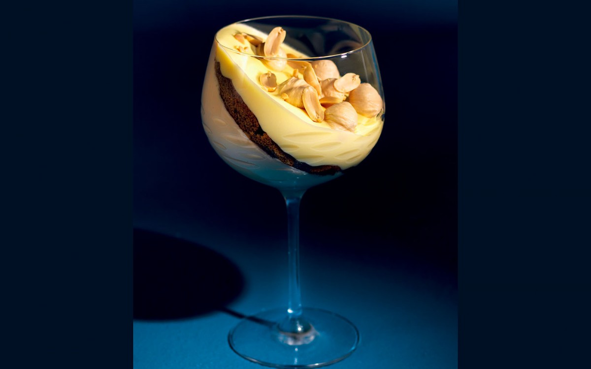 To assemble the tiramisu: Remove the cups from the freezer. Soak the ladyfingers in espresso, then layer them in the cups. Top with the mascarpone cream. Refrigerate for 3 hours. Garnish with the roasted nuts and serve.