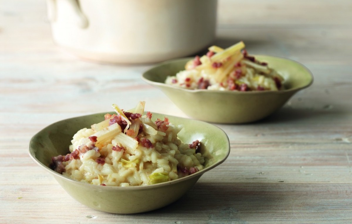 Clean the globe artichoke and set aside the softer sprouts. Bring a pot of water to the boil with a lemon slice and a bay leaf, then add the cleaned and chopped globe artichoke (not the sprouts) and cook for 40 minutes. Salt at the end of cooking. Remove the globe artichoke, reserving the cooking liquid. Blend half in a blender, then strain the resulting sauce through a sieve. Set aside and keep warm. Remove the sausage meat from its casing, crumble, and brown in a dry frying pan for 5 minutes, then add the chopped artichoke sprouts and brown a further 5 minutes. In a large saucepan, heat 3 1/2 tbsp butter, the remaining boiled and chopped artichoke, and half of the cooked sausage and artichoke mixture. After a few minutes, add the rice and toast for 1 minute. Begin adding the artichoke cooking liquid (if not enough, supplement with vegetable broth), bring to the boil and cook for 18 minutes. Remove from the heat and stir in the remaining butter, the Grana Padano, and the reserved sauce, then top with the remaining sausage and artichoke mixture and serve immediately.