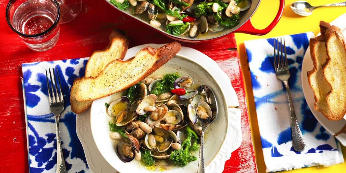 Clean the pan and heat some more oil to sauté 1 clove of garlic. Add the mushrooms and sauté for 1 minute. Then add the turnip greens and cannellini beans. Add some of the clam cooking water, followed by the vegetable stock and clams. Bring everything back to a boil and turn off the heat. Add salt and pepper to taste. Slice the baguette loaf and toast the slices in a pan with a drizzle of oil. Serve with the soup.