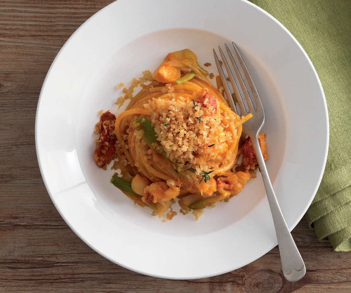 Cook the spaghetti in a large pot of boiling salted water until al dente. Strain and add to the pan with the sauce. Add the lobster, scampi, and spring onions and stir to coat evenly. Distribute on plates and top with the crispy bread crumbs. Serve immediately.