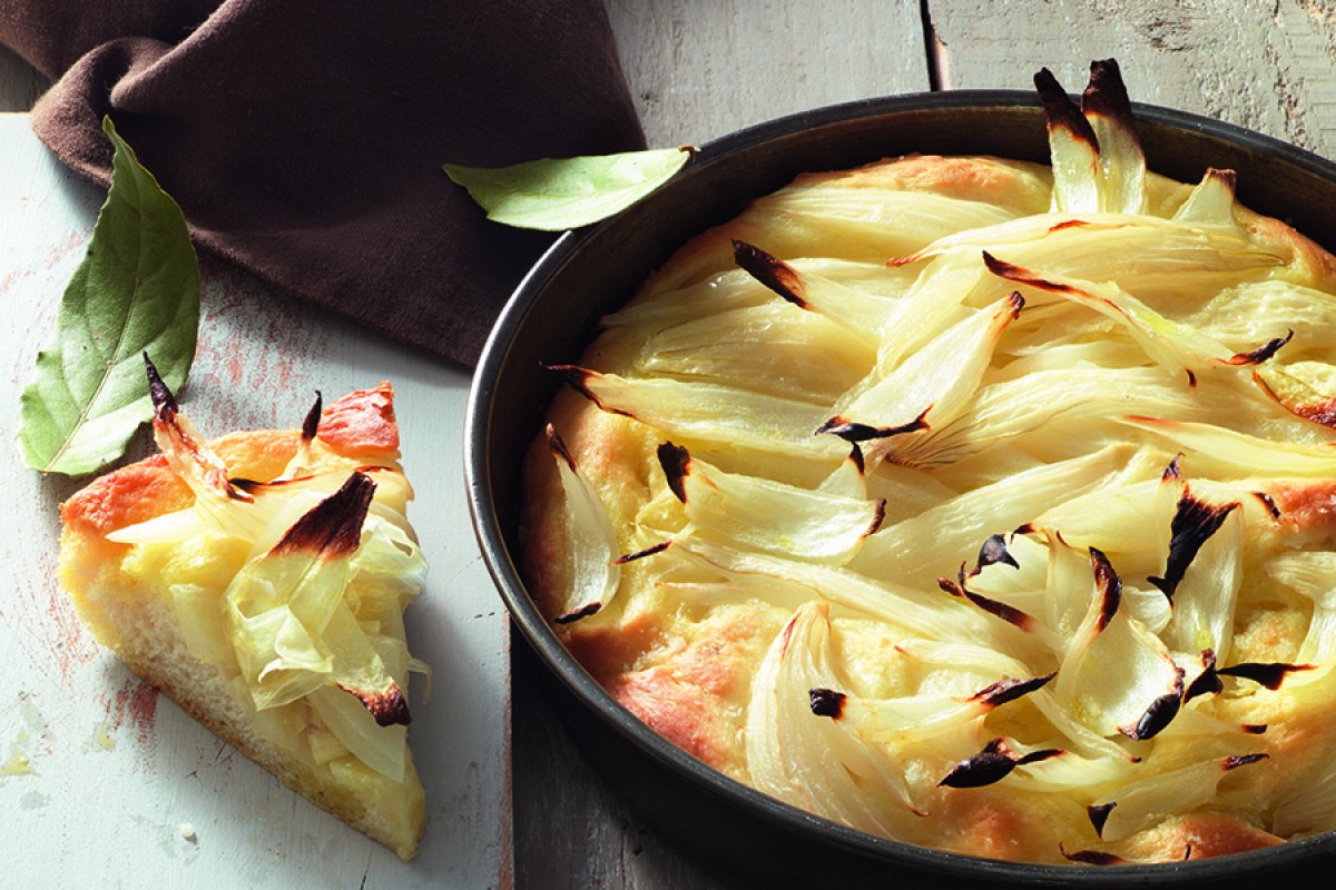 Peel and slice the onions. Cook in boiling water for 5 minutes. Drain well and distribute evenly over the focaccia dough. Drizzle with olive oil and season with salt. Bake for 25-30 minutes.