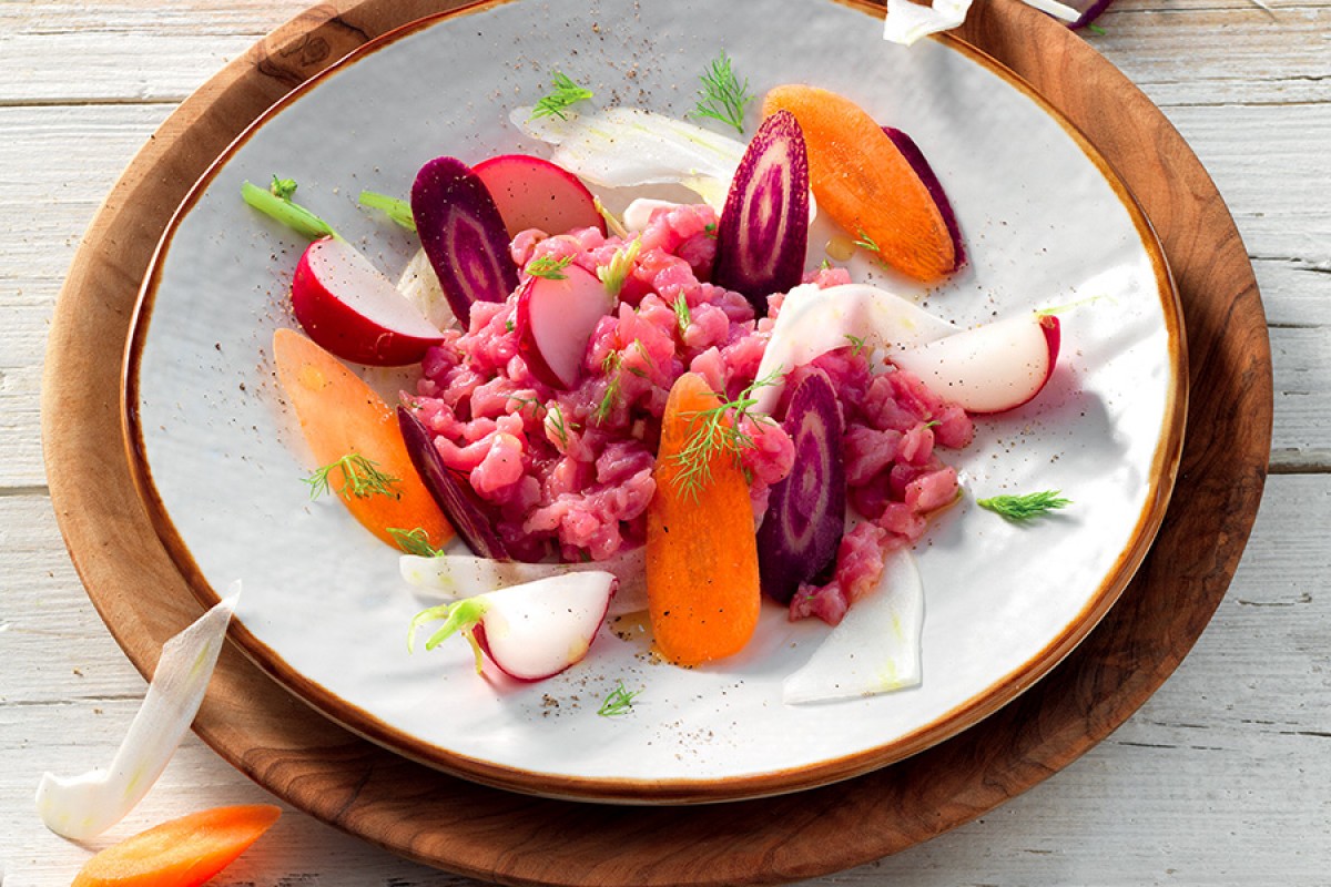 To make veal tartare with ginger, first use a knife to finely chop the veal tenderloin to make the tartare. Finely slice the carrots and fennel, reserving some of the fronds.