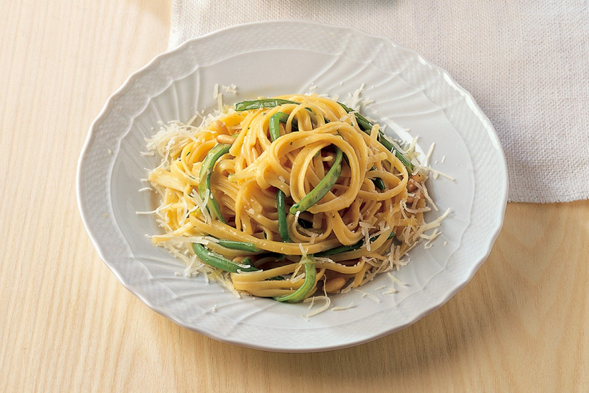 Boil the linguine until cooked al dente. Strain them and place them directly into the pan with the string beans and asparagus. Toss everything together for 1 minute, then add the beaten egg yolks, stir, and serve immediately. Top with grated Grana Padano or Pecorino Romano cheese to taste.